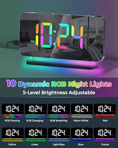 - 【إضاءة ليلية RGB بـ 10 ألوان】: تحتوي ساعة المنبه الرقمية على شريط إضاءة RGB مدمج مع 10 أوضاع ألوان (3 ألوان RGB ديناميكية + 7 أوضاع ألوان ثابتة)، مع 5 مستويات من السطوع القابل للتعديل، ويمكن استخدامها كإضاءة محيطة ليلية في غرفة النوم.