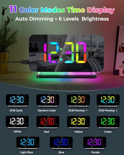 - 【شاشة LED رقمية بـ 11 لونًا】: تستخدم ساعة المنبه LED شاشة LED متغيرة اللون مع 11 وضعًا لونيًا (4 ألوان RGB ديناميكية + 7 أوضاع ألوان ثابتة)، 6 مستويات سطوع قابلة للتعديل يدويًا، ووظيفة التعتيم التلقائي التي يمكن اختيارها أيضًا.