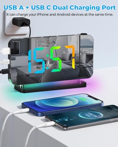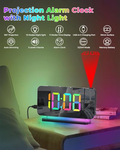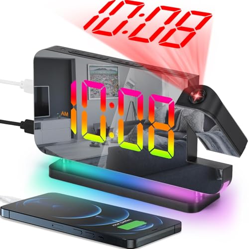 LBOYLOVE - جهاز عرض ساعة منبه رقمية 19 سم لسقف غرفة النوم مع جهاز عرض قابل للدوران 180 درجة، إضاءة ار جي بي بـ 11 لون مع منفذ شاحن USB C وتعتيم تلقائي من ال بوي لوف®