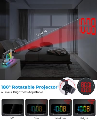 - 【ساعة منبه عالية الدقة】: يمكن أن يدور جهاز العرض ±90 درجة، ويمكن قلب نمط الإسقاط أفقيًا 180 درجة وسطوع الإسقاط رباعي المستويات قابل للتعديل. مسافة الإسقاط الفعالة لساعة المنبه هي 1.64-11.4 قدم (0.5-3 متر)، والتي يمكنها عرض الوقت بوضوح. أفضل مكان على الحائط أو السقف، يسمح لك بمشاهدة الوقت بسهولة.