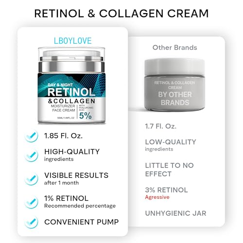 LBOYLOVE - كريم مرطب للوجه بالريتينول والكولاجين من لبوي لوف، مرطب للوجه مع حمض الهيالورونيك بنسبة 5% للنساء والرجال، كريم وجه ريتينول مضاد للشيخوخة ليلا ونهارا لجميع انواع البشرة (1.8 اونصة/55 مل)