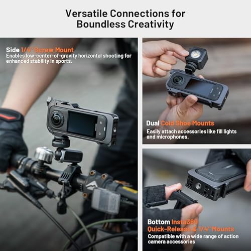 - ️【منافذ توسيع متعددة】مجهزة بحوامل تثبيت مزدوجة على البارد وفتحات براغي 1/4 انش (جانبية وسفلية)، وقاعدة سريعة الفك متوافقة مع انستا 360، مما يمنحك أقصى قدر من المرونة لربط المصابيح والميكروفونات والحوامل الثلاثية وغيرها من الملحقات.