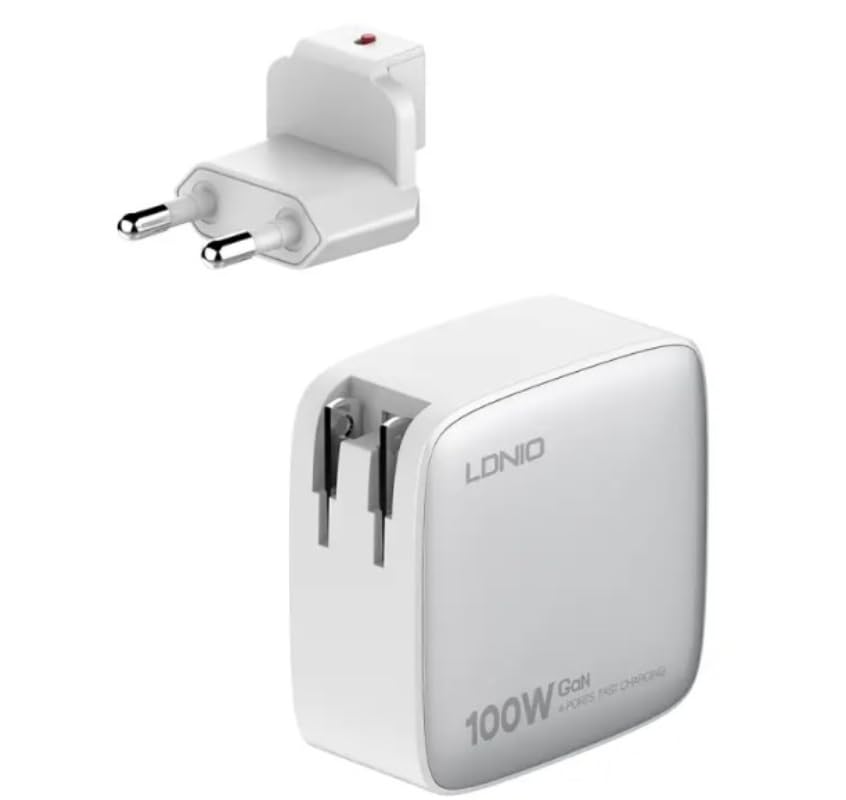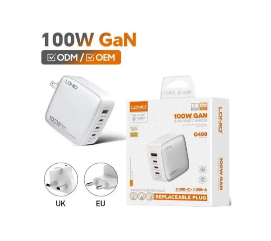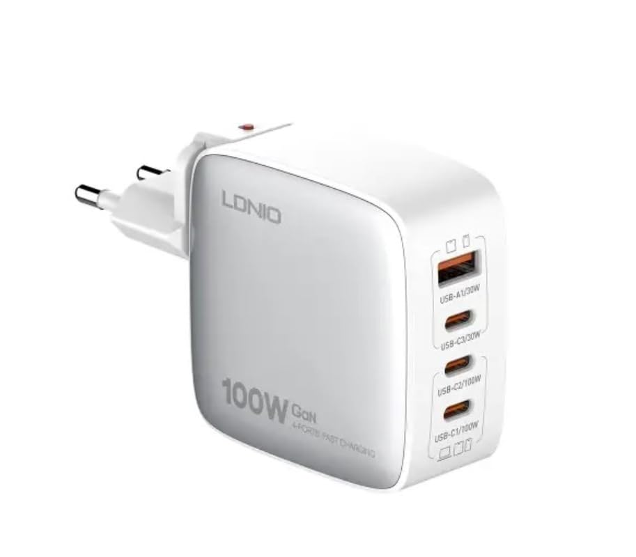 LDNIO - LDNIO شاحن حائط سريع Q408 بقدرة 100 واط من لدنيو، يتميز بتقنية جان ويدعم 4 اجهزة في نفس الوقت، 3 منافذ USB-C + 1 USB-A - ابيض