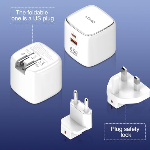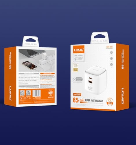 LDNIO - LDNIO شاحن حائط سريع 65 واط Q2617 مع قابس قابل للطي شاحن موبايل مع محول PD/QC 3.0. مع كابل USB-C الى USB-C - ابيض