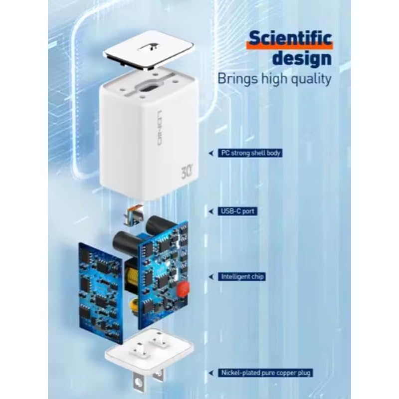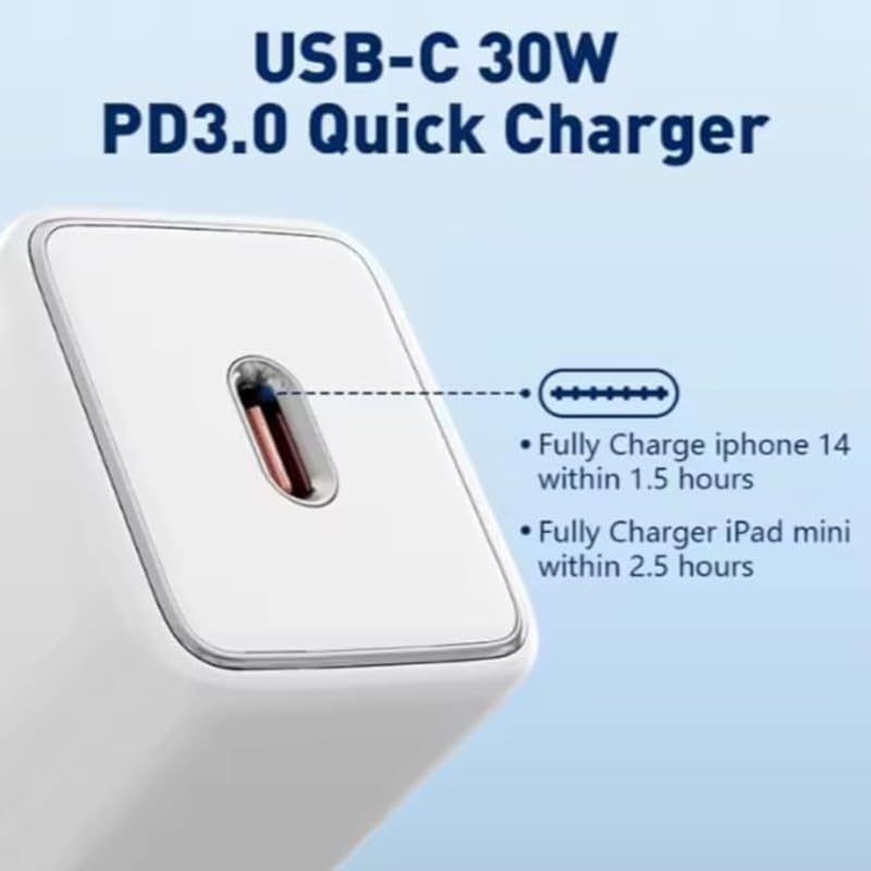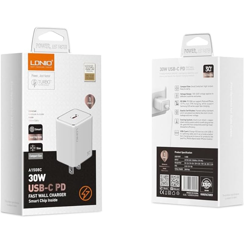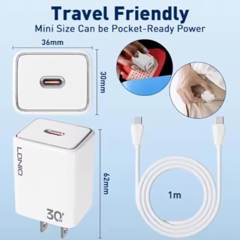 LDNIO - شاحن حائط سريع A1508C مع كابل USB- C PD ومن النوع C إلى لايتنينج مع كابل يناسب العديد من الأجهزة من لدينو 30 واط - أبيض