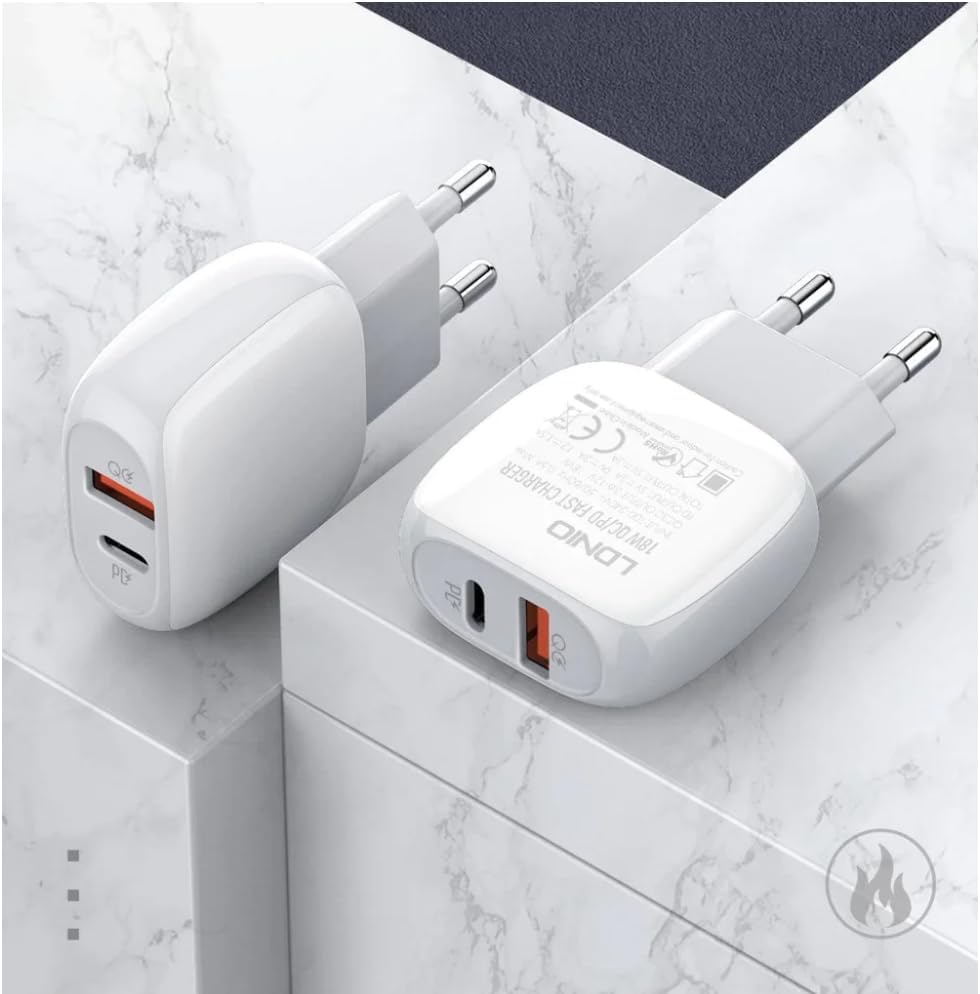 LDNIO - محول شاحن سريع بمنفذين 18 وات بتقنيتي بي دي وكيو سي للشحن السريع A2313C للسفر قابس أوروبي مع كابل نوع إلى لايتنينج من ليندو - أبيض