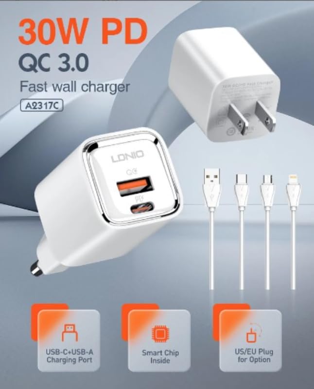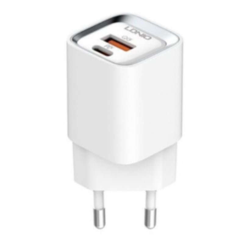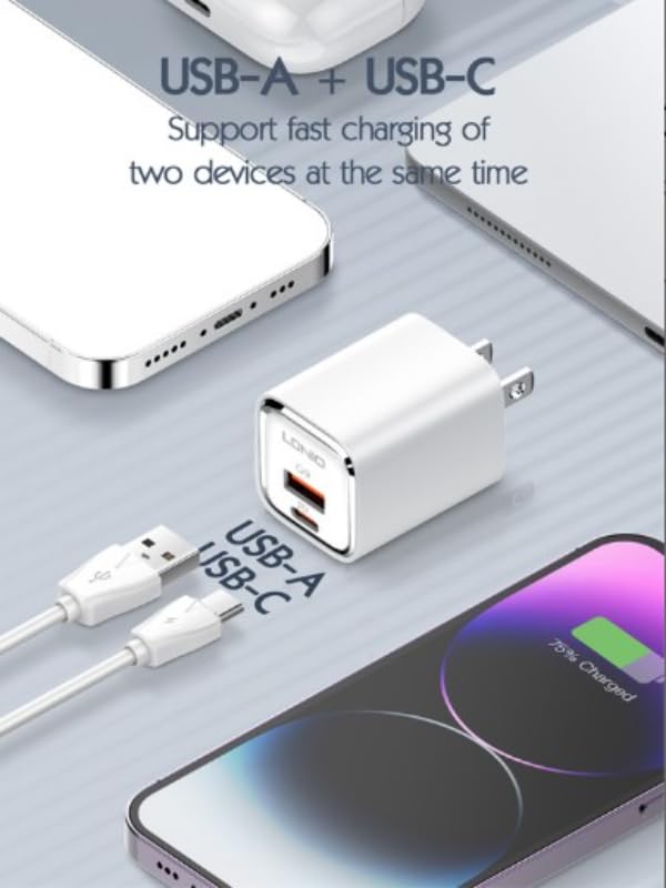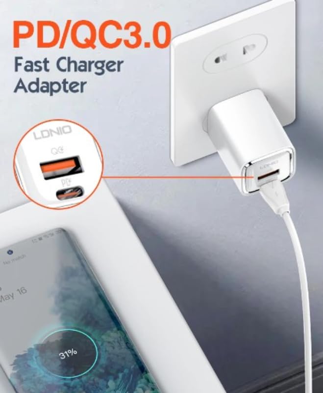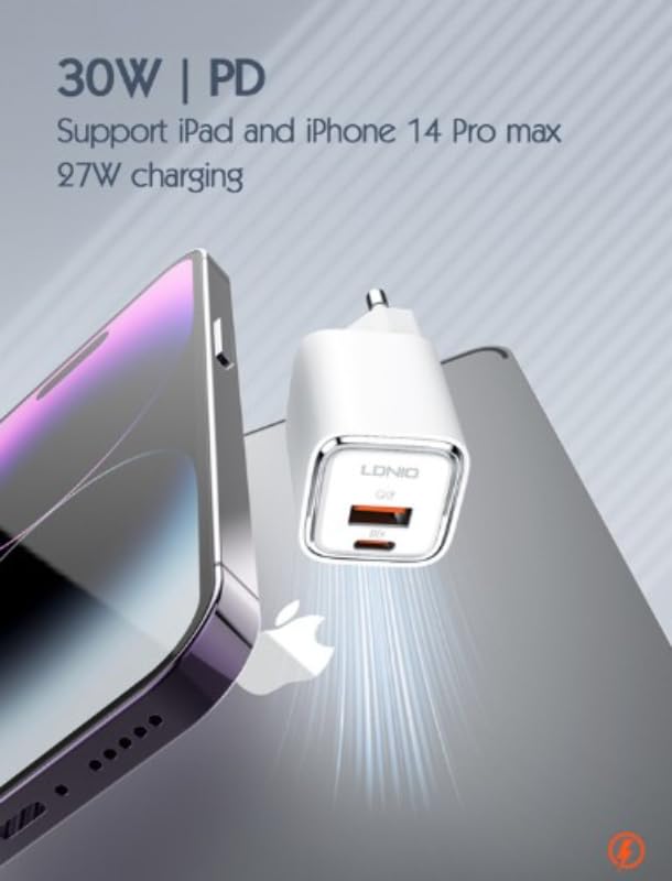 LDNIO - شاحن جداري سريع A2317C بقوة 30 وات (يشمل كابل USB-C إلى USB-C بطول 1 م)، مُحول طاقة عالي السرعة بتقنية Power Delivery للموبايلات وأجهزة التابلت والمزيد، بتصميم مدمج وآمن من لدينو أبيض