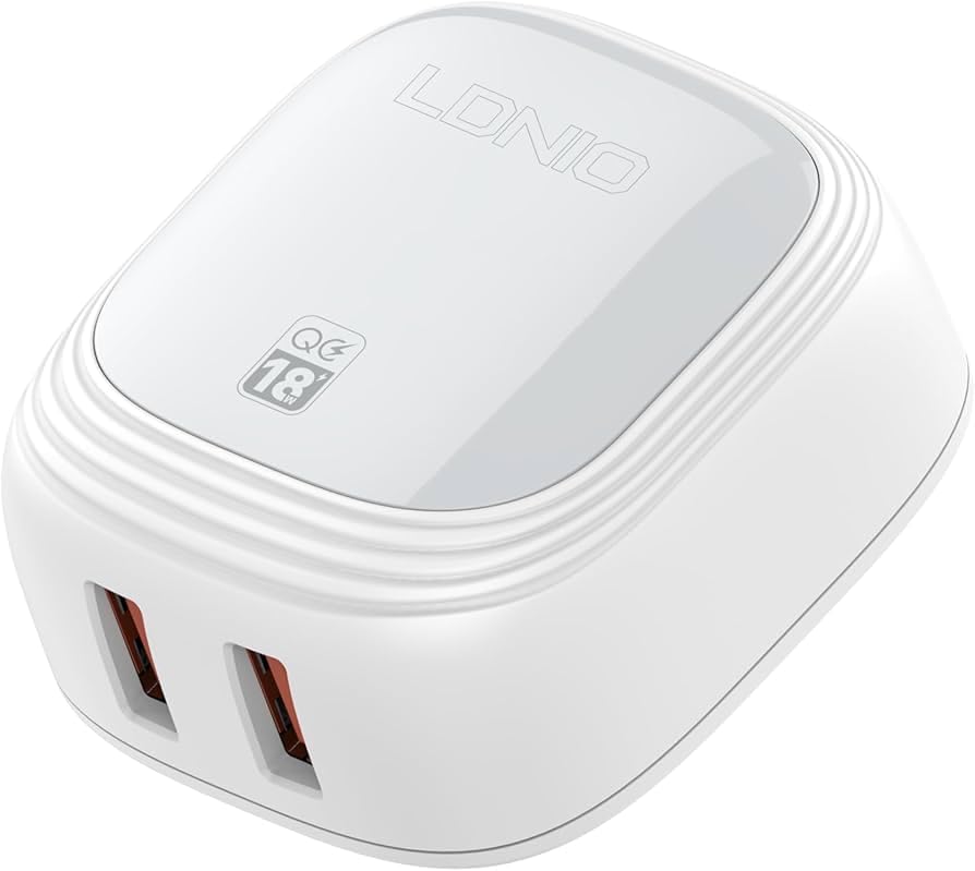 LDNIO - شاحن سريع موديل A2512Q بفيشة عالمية مع كابل نوع سي ومنفذي USB ميني مزدوجين لموبايل آيفون 18W من LDNIO - أبيض