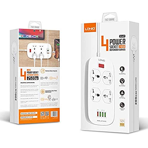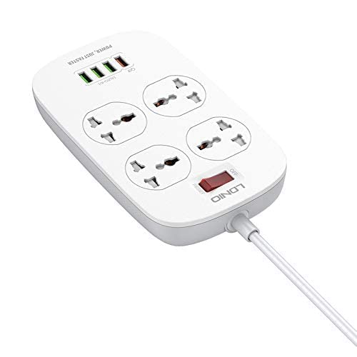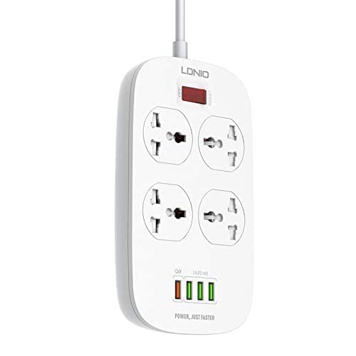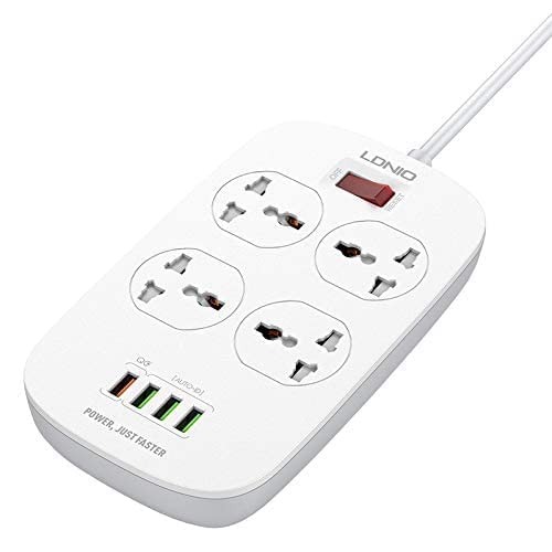 LDNIO - لدنيو شاحن و مشترك كهربائي مع 4 عين UK و ثلاث مخارج USB بقدرة 3.4 أمبير, و مخرج QC3 بقدرة 18 واط بجسم مضاد للحريق و كابل بطول 2 متر 2500 واط