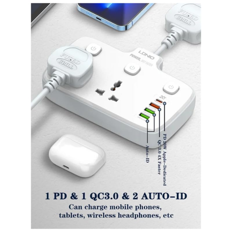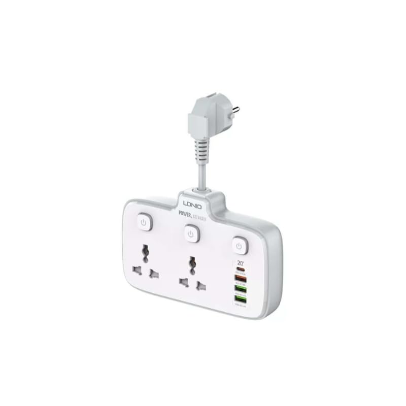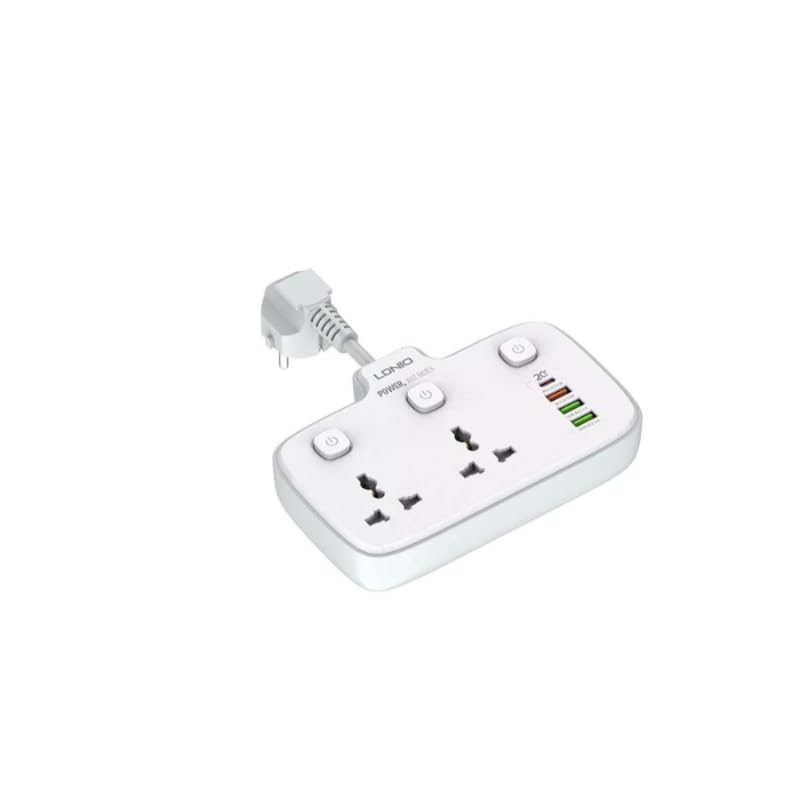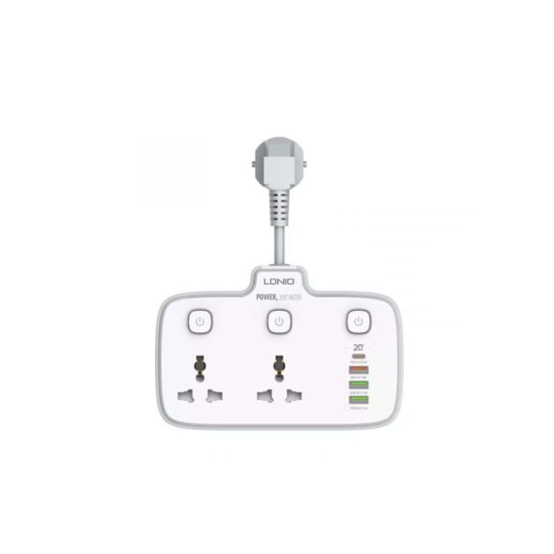 LDNIO - لدينو شريط طاقة عام بشكل برج بقدرة 20 وات يحتوي على منفذين طاقة و3 منافذ USB ومنافذ PD مع أزرار تحكم بالطاقة، لون أبيض، SC2413