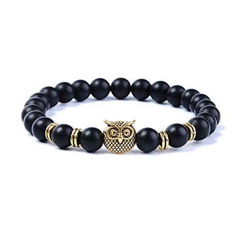 generic - سوار خرز من العقيق اليماني الاسود غير اللامع مقاس 8 ملم من ليون جوليري، خرز مالا بتعليقة على شكل بومة شاكرا للطاقة واليوجا والشفاء
