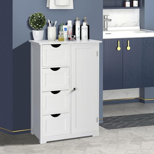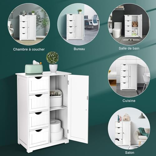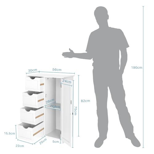 LEADZM - خزانة حمام موفرة للمساحة من ليدزم، خزانة تخزين مع 4 ادراج وخزانة مع رف قابل للتعديل مع باب، خزانة ادراج للحمام/غرفة المعيشة/المطبخ، 55 × 30 × 80 سم، ابيض