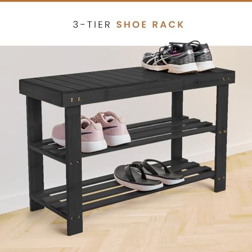 Leaf & Grain - رف احذية من الخيزران من ليف اند جرين - مقعد تخزين احذية لمدخل الباب الامامي - مقعد مدخل مع رف احذية، منظم تخزين الاحذية، رف احذية خشبي، مقعد احذية متين للمنزل (رمادي)