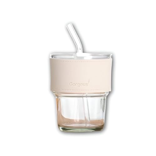 Generic - ماصة زجاجية مانعة للتسرب - كوب قابل لاعادة الاستخدام سعة 400 مل مع غلاف جلدي وقشة سيليكون وغطاء محكم، مثالي للقهوة والشاي والحليب والزبادي باللون الابيض.