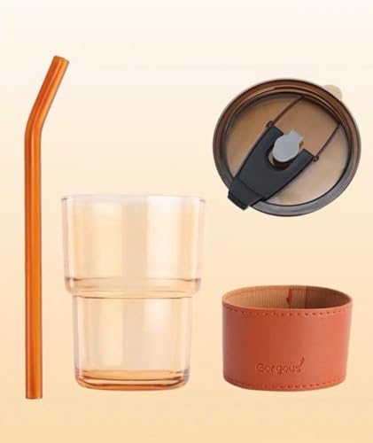 Generic - كوب زجاجي مقاوم للتسرب مع ماصة وغطاء | غطاء واقي من الجلد | قابل لاعادة الاستخدام | قهوة مثلجة | شفاف