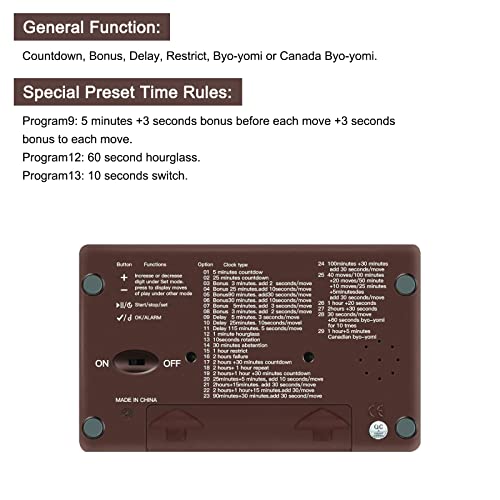 - قواعد التوقيت المحددة مسبقًا: هناك 29 برنامج توقيت معلمة محددة مسبقًا لساعة الشطرنج