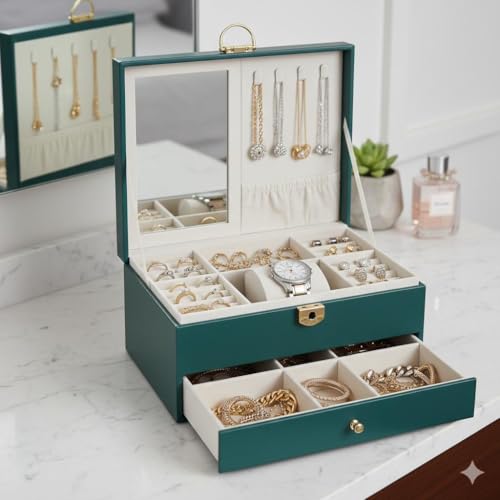 Generic - صندوق مجوهرات جلدي - تصميم حامل ساعة ذكي ودرج مخصص اخر للخواتم والسلاسل والحلقان وكل شيء في مكان واحد
