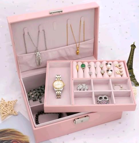 Generic - علبه مجوهرات جلدي، لون وردي، علبة تخزين إكسسوارات مع قفل