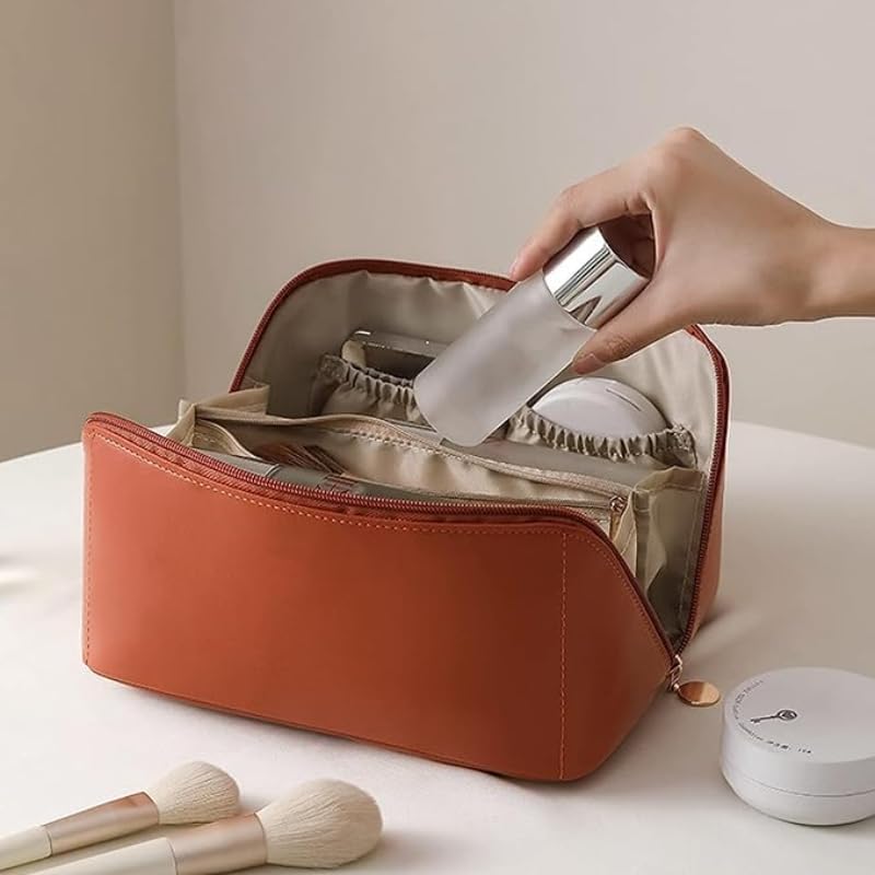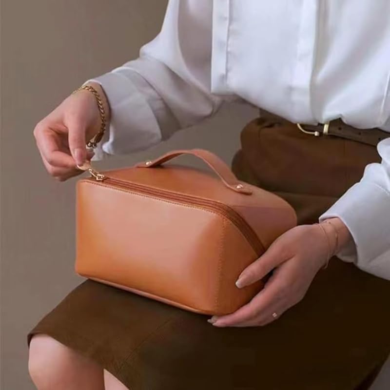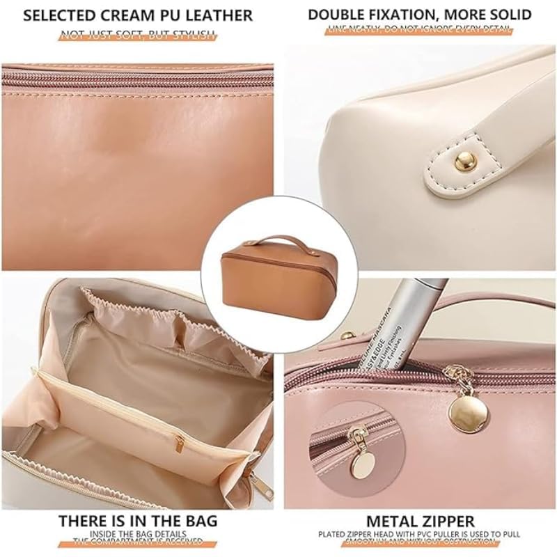 Generic - شنطة تخزين جلدية محمولة مقسمة بسعة كبيرة ومقبض قوي عملي لادوات الزينة للبنات - لون هافان