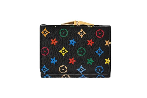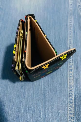 Generic - محفظة جلدية ، أسود بنقوش ملونة، تصميم زهور ودوائر، محفظة مدمجة بمشبك ذهبي