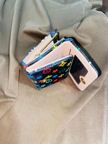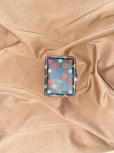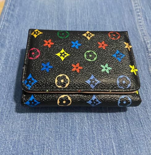 - تصميم عصري وملون: محفظة جلدية سوداء مزينة بنقوش ملونة زاهية على شكل زهور ودوائر بألوان متعددة تضفي لمسة حيوية وأنيقة