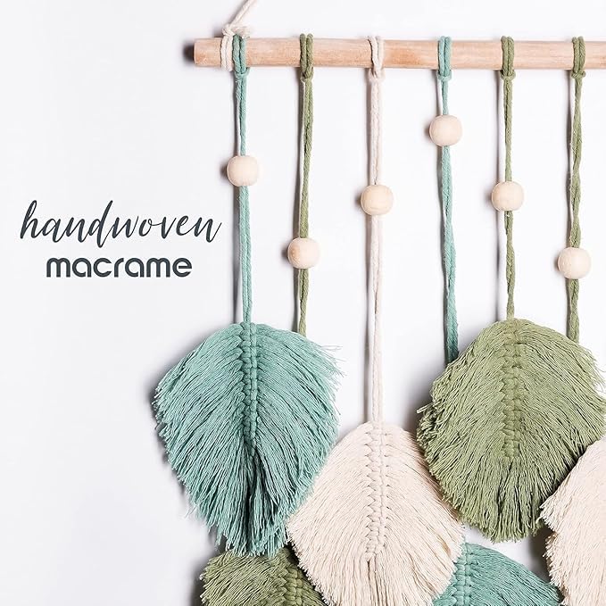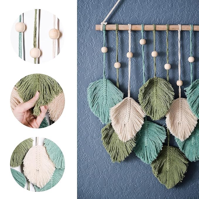 Divinecho - مكرمية بتصميم أوراق شجر والريش للتعليق على الحائط من القطن بنمط بوهو أنيق وشراشيب من نسيج محبوك يدويا شكل ورق الشجر لتزيين غرفة المعيشة