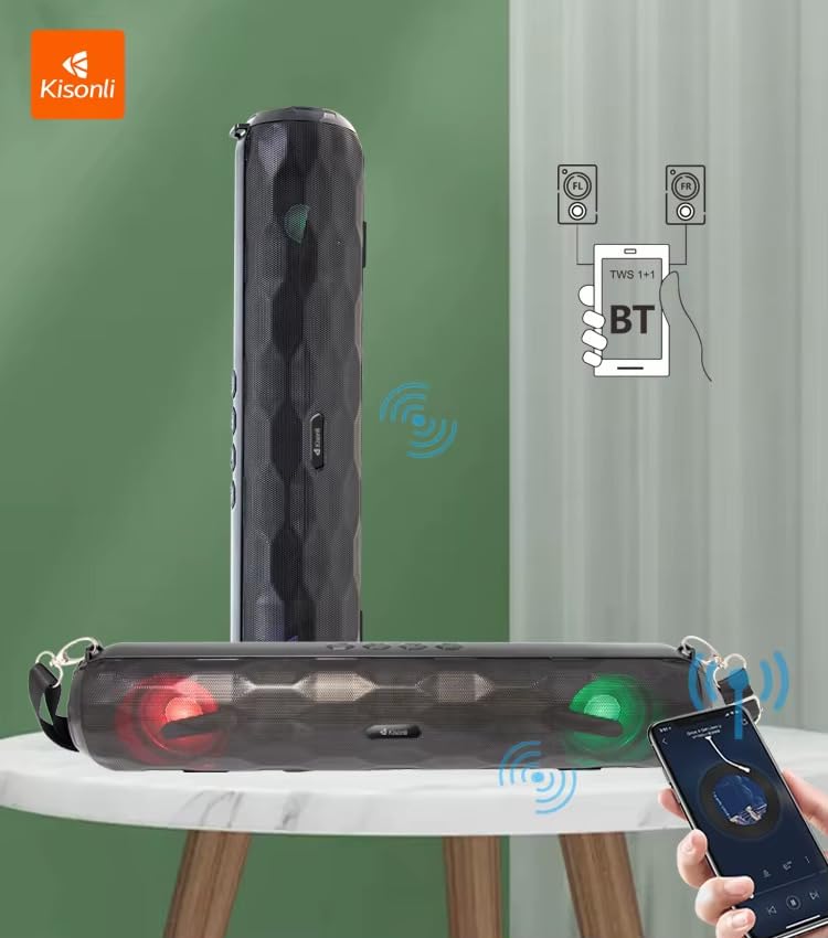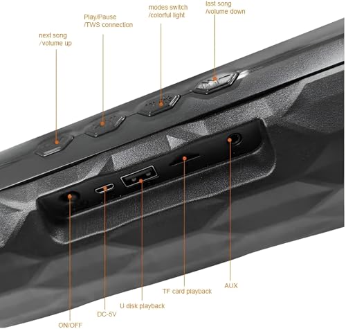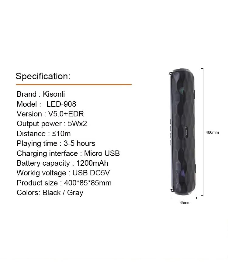 Generic - مكبر صوت بلوتوث موسيقي LED-908 - صوت ستيريو عالي النقاء، بقوة 10 واط وإضاءة ليد تفاعلية وبطارية 1200 مللي امبير مع دعم AUX وذاكرة TF وقرص U، أسود