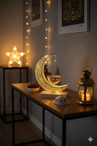- تصميم إسلامي مميز: مبخرة على شكل هلال مزخرف بنقوش هندسية جميلة مع فانوس معلق وقبة مزينة بنجوم، تضيف لمسة روحانية وجمالية لديكور منزلك