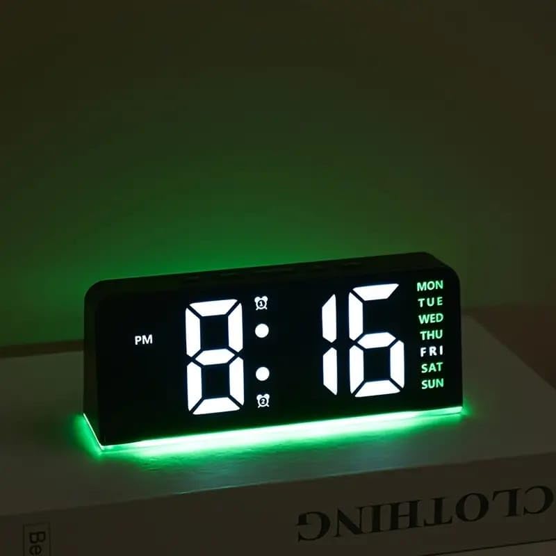 - ⏰ شاشة LED كبيرة وواضحة: عرض الوقت بشكل رقمي بحجم كبير يسهل قراءته من أي زاوية أو مسافة. 🌈 إضاءة خلفية ملونة: تصميم عصري مع إضاءة ليلية هادئة تضيف لمسة جمالية لغرفتك. 📅 عرض أيام الأسبوع والتاريخ: يساعدك على متابعة جدولك اليومي بسهولة. 🔔 منبه مزدوج: إمكانية ضبط أكثر من منبه للاستيقاظ أو التذكير بالمواعيد. 🛋️ تصميم أنيق متعدد الاستخدامات: مثالية لغرف النوم، المكتب، أو حتى غرفة المعيشة. 🔌 تشغيل سهل: تعمل بالكهرباء مع بطارية احتياطية لحفظ الوقت والإعدادات.