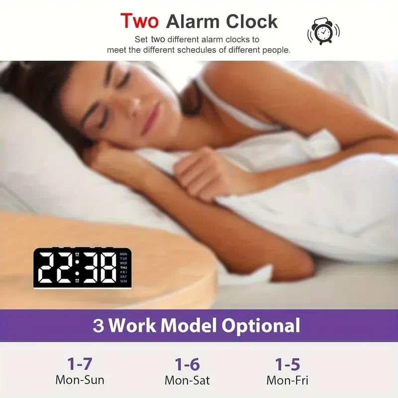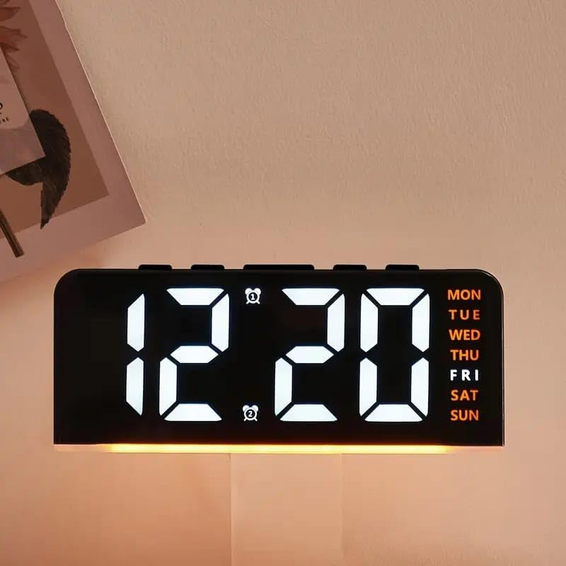 - ⏰ شاشة LED كبيرة وواضحة: عرض الوقت بشكل رقمي بحجم كبير يسهل قراءته من أي زاوية أو مسافة. 🌈 إضاءة خلفية ملونة: تصميم عصري مع إضاءة ليلية هادئة تضيف لمسة جمالية لغرفتك. 📅 عرض أيام الأسبوع والتاريخ: يساعدك على متابعة جدولك اليومي بسهولة. 🔔 منبه مزدوج: إمكانية ضبط أكثر من منبه للاستيقاظ أو التذكير بالمواعيد. 🛋️ تصميم أنيق متعدد الاستخدامات: مثالية لغرف النوم، المكتب، أو حتى غرفة المعيشة. 🔌 تشغيل سهل: تعمل بالكهرباء مع بطارية احتياطية لحفظ الوقت والإعدادات.