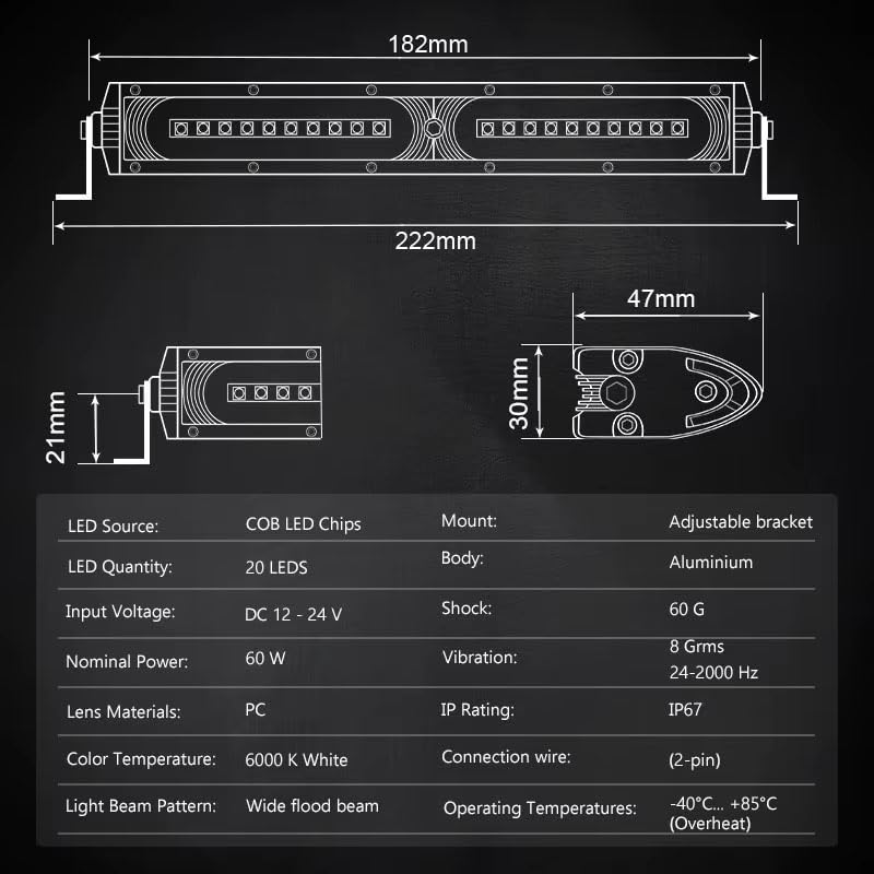 - مواصفات الطاقة: يعمل شريط الإضاءة 60 وات على كل من نظامي 12 فولت و24 فولت، مما يوفر إضاءة قوية مع الحفاظ على كفاءة الطاقة