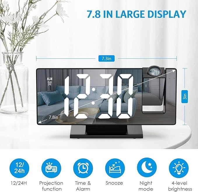 - إسقاط ذكي: جهاز عرض دوار 180 درجة يلقي الوقت على الحائط أو السقف، لذلك لن تضطر أبدًا إلى لف رقبتك في السرير.