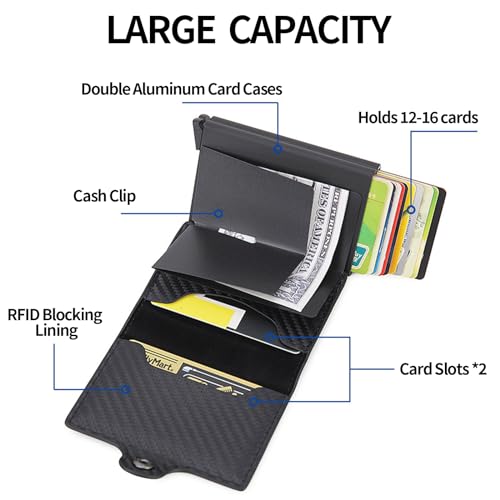 - مساحة المحفظة: حافظة بطاقات من الألومنيوم مزدوجة الطبقات يمكنها حمل 12-16 بطاقة مع فتحتين إضافيتين للبطاقات وجيب للملاحظات. هذه هي محفظة البطاقات المنبثقة المثالية مدى الحياة!