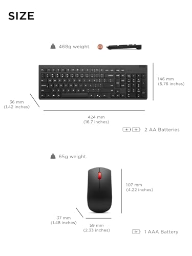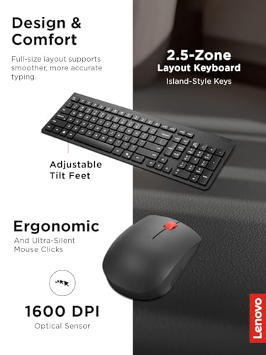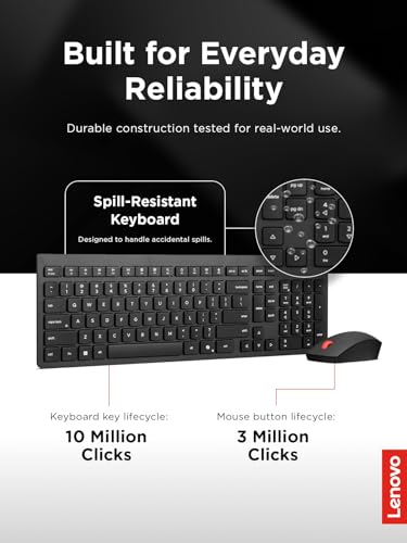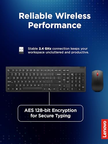 Lenovo - لينوفو- كيبورد وماوس لاسلكي اسنشيال جيل 2 انجليزي امريكي، اتصال USB لاسلكي 2.4 جيجاهرتز، تشفير AES-128 للكيبورد، ماوس مستشعر بصري لليد اليمنى او اليسرى، اسود
