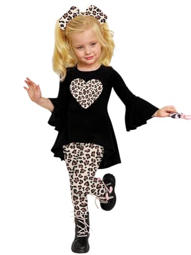 Generic - طقم ملابس للبنات بتصميم قلب فهدي، أسود، بلوزة بأكمام طويلة وبنطلون ليجنز سن 5ل7 سنوات