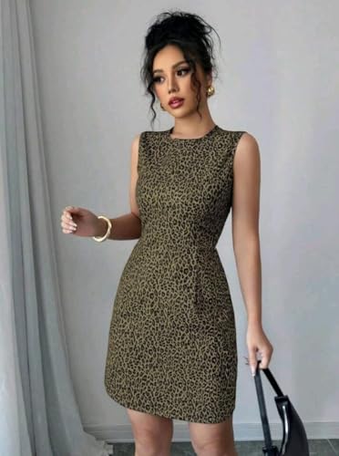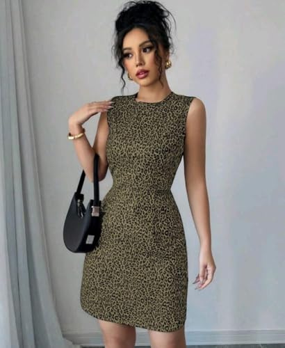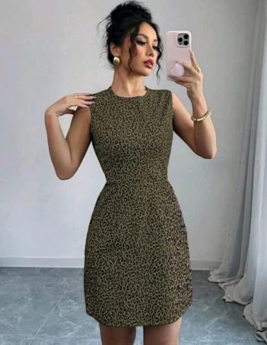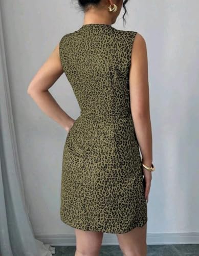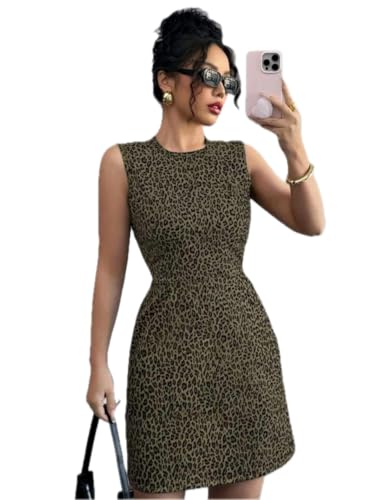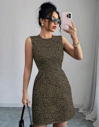 Generic - فستان ايه لاين مطبوع عليه جلد الفهد، بدون اكمام، خصر مرتفع، قبة دائرية، طول قصير، متعدد الالوان