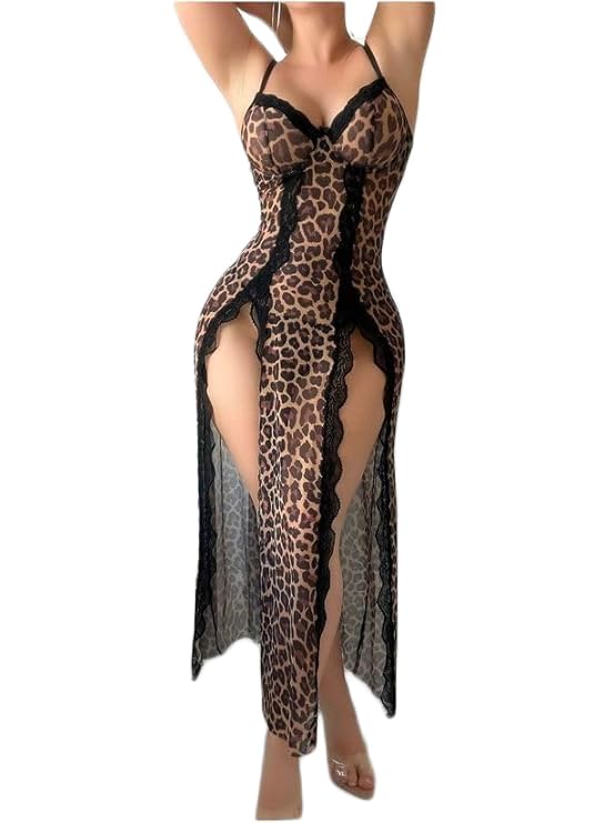 Generic - ثوب نوم مزين بالدانتيل بطبعة جلد الفهد، فستان طويل مقسوم مع اشرطة رفيعة بلون بني واسود