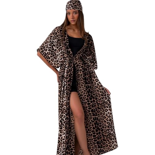 Generic - عباية كيمونو طويلة بنقشة الفهد، فستان شاطئ بأكمام قصيرة مع عصابة رأس، طبعة حيوانية فري سيز