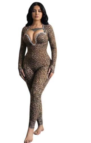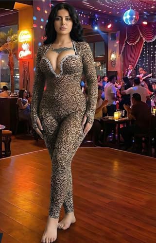 Generic - جمبسوت لانجري بقصة ضيقة واكمام طويلة وقبة V عميقة وطبعة جلد الفهد