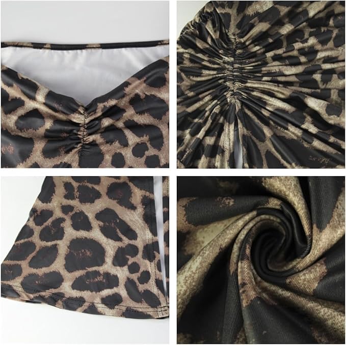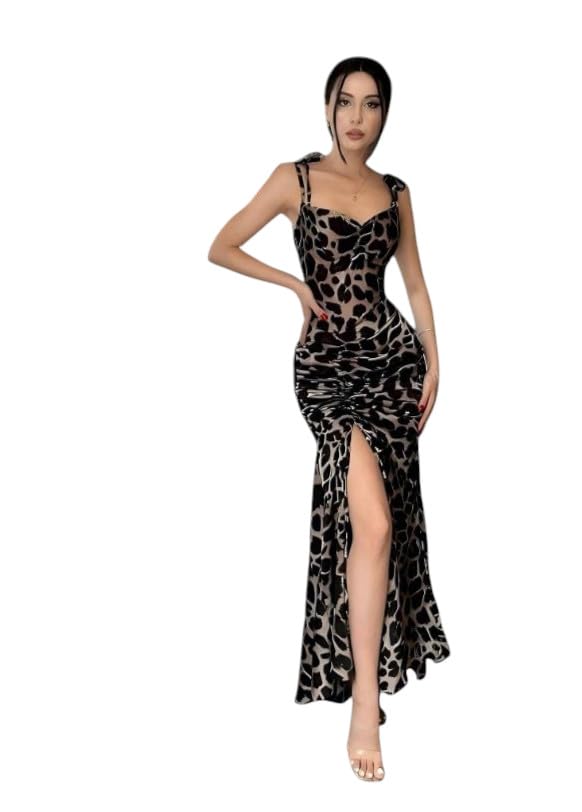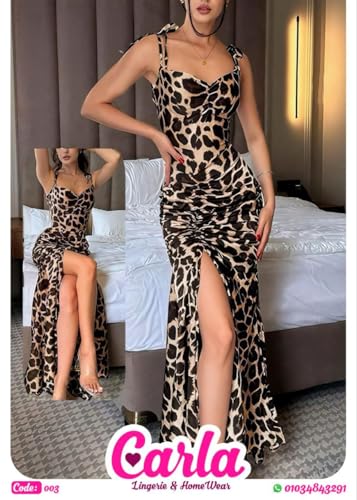 Generic - فستان لانجيري ماكسي بطبعة جلد الفهد مع فتحة جانبية واشرطة كتف برباط، اسود وبيج