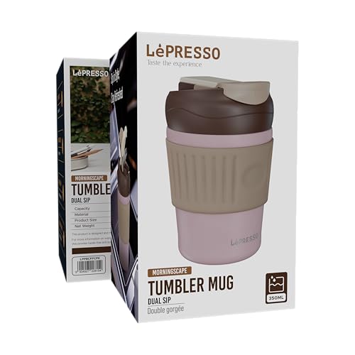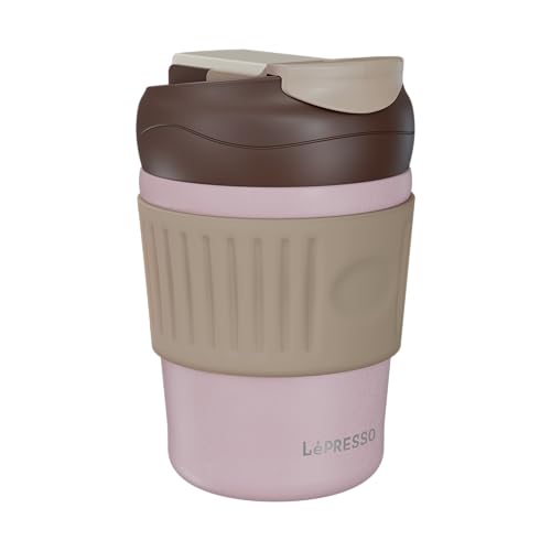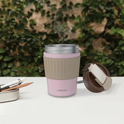 LePresso - كوب مزدوج للشرب من الفولاذ المقاوم للصدأ خالٍ من مادة بيسيفينول أ، غطاء محكم يمنع التسرب، قبضة مريحة، عزل حراري متين للقهوة الساخنة والمشروبات الباردة المنعشة من لوبريسو، 350 مل، وردي