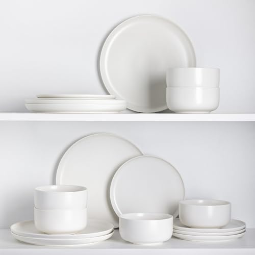 LERATIO - طقم عشاء لستة أشخاص من لريشيو، طقم أطباق وبولات من الفخار الحجري مكون من 18 قطعة، مقاوم للخدش والكسر، طقم أواني فخارية آمنة للاستخدام في الفرن وغسالة الأطباق والميكروويف (أبيض، يكفي لستة أشخاص)