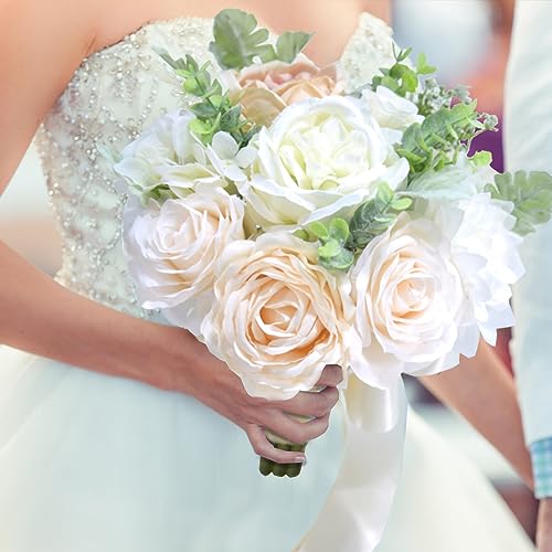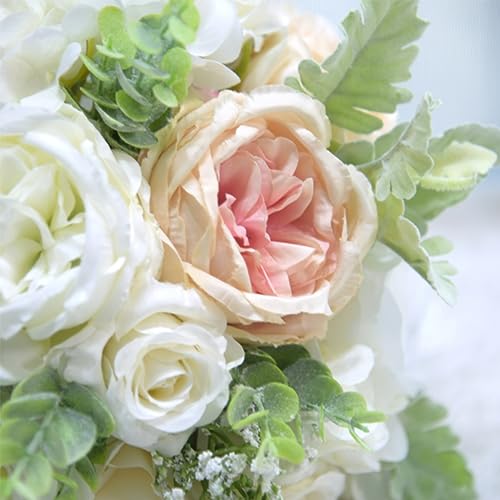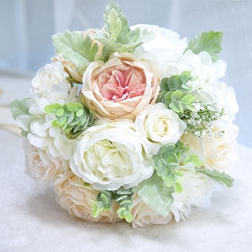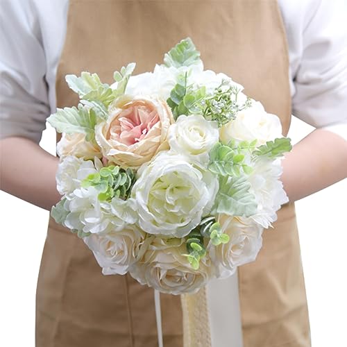 LESING - باقة زهور زفاف صناعية يدوية الصنع بتصميم رومانسي للعروس ووصيفات العروس التي تحمل الزهور من ليسينج (باقة زهور الفاوانيا وردية وبيضاء)