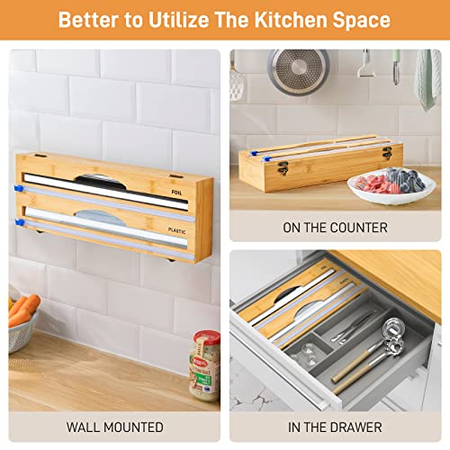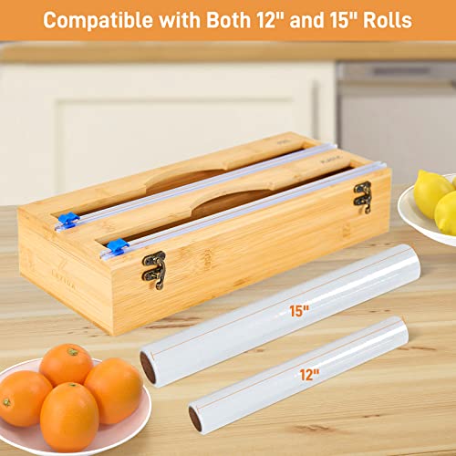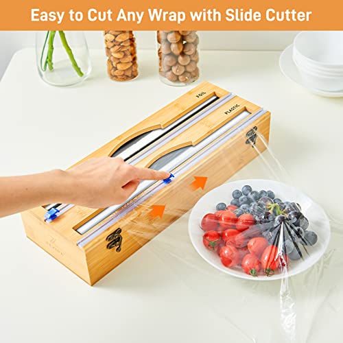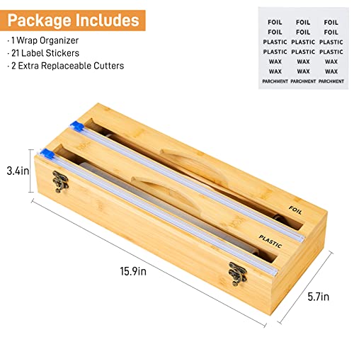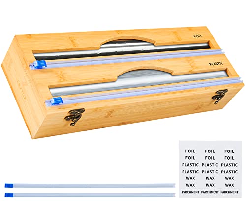 LEZIOA - موزع تغليف من الخيزران 2 في 1 مع قطاعة وملصقات من ليزيوا، غلاف بلاستيكي، موزع ورق رقائق الألومنيوم وورق الشمع لدرج المطبخ، حامل منظم طويل من الخيزران، متوافق مع غطاء 15 انش