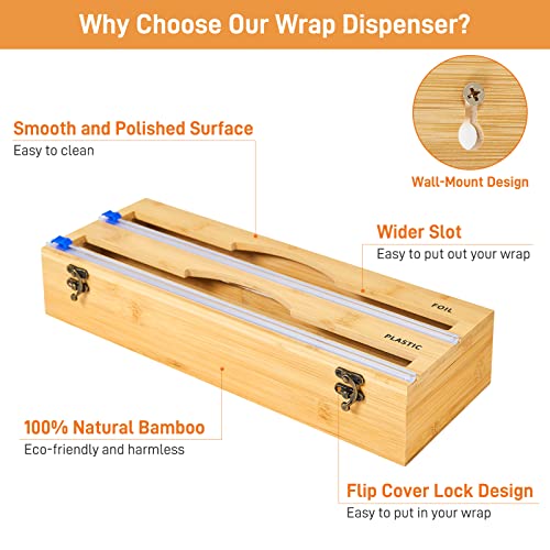 - 【 موزع تغليف 2 في 1 مع قطاعة】-- منظم التغليف البلاستيكي والفويل هذا مع أداة تقطيع مصنوعة من الخيزران الطبيعي بنسبة 100%. الجودة الممتازة والحرفية الممتازة تجعلها أكثر استقرارًا ومتانة للاستخدام طويل الأمد. الحجم: 15.9 انش × 5.7 انش × 3.4 انش
