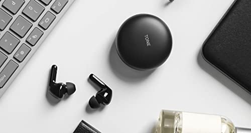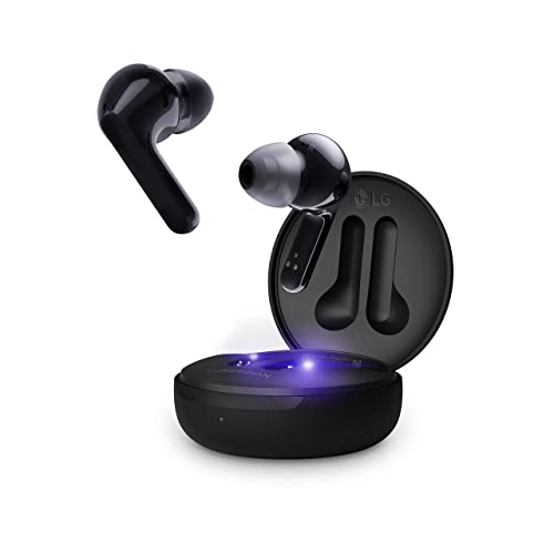 LG - سماعات اذن بلوتوث لاسلكية تون فري FN6 بميكروفون مزدوج للعمل او المنزل من ال جي بجراب شحن لاسلكي خالٍ من البكتيريا بنسبة 99.9% بتقنية التعقيم بالاشعة فوق البنفسجية، مقاومة للماء اي بي اكس 4، اسود