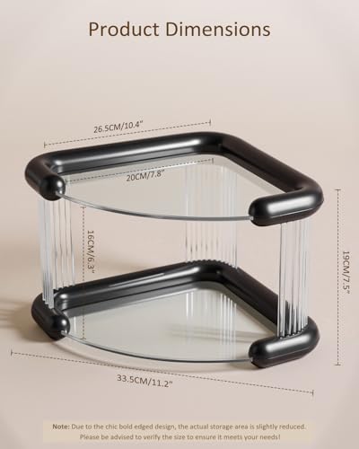 - منظم زاوية الحمام: تم تصميم منظم سطح الطاولة الموفر للمساحة ليناسب أي زاوية بشكل مريح، مما يجعله مثاليًا للمساحات الصغيرة (10.4 انش × 10.4 انش × 7.5 انش). استخدم الطبقات المكدسة أو بشكل منفصل كمنظم للعطور، ومنظم للعناية بالبشرة، ومنظم للتزيين، ومنظمات المكياج، ومنظم لسطح المطبخ