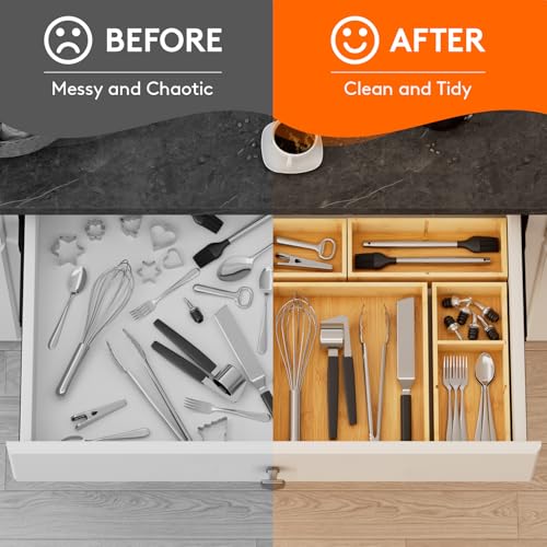 Lifewit - منظمات أدراج من 5 قطع (11 شبكة) مع 6 حشوات، فواصل أدراج خشبية قابلة للتعديل، صندوق تخزين قابل للتكديس للأواني وأدوات المطبخ والمكياج والخردة في المطبخ/الحمام/المكتب/فانيتي من لايفويت