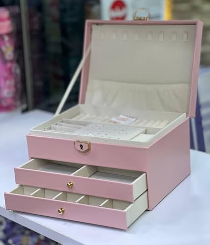 Generic - صندوق مجوهرات وردي فاتح مع درجين، منظم مجوهرات متعدد الطبقات مع قفل، حامل مجوهرات بتصميم أنيق