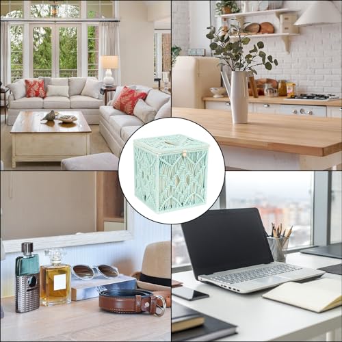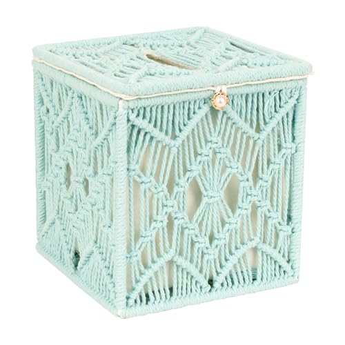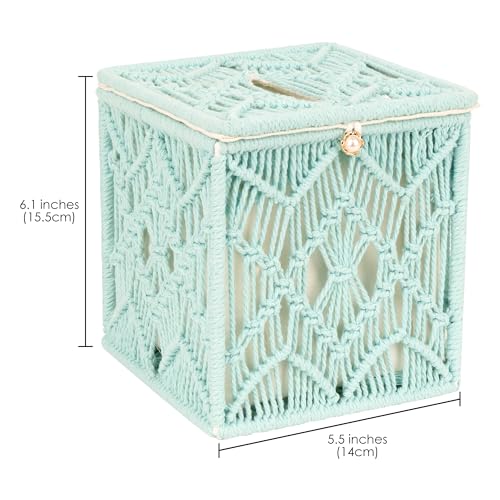 Philo Fun - غطاء علبة مناديل مكرمية بلون أخضر مزرق فاتح، مربع الشكل، حبل مضفر بنمط بوهو، حامل تخزين مناديل بتصميم ساحلي، ديكور ساحلي للنساء